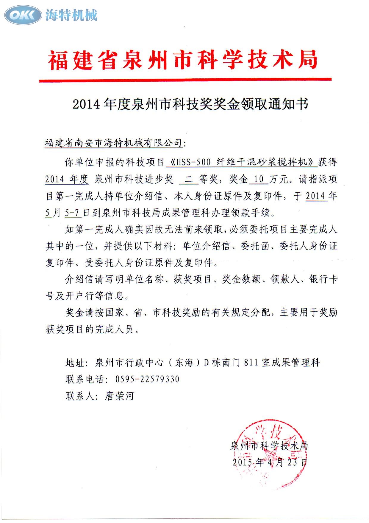 2014年 纖維攪拌機(jī) 泉州市科技進(jìn)步獎(jiǎng)二等獎(jiǎng)