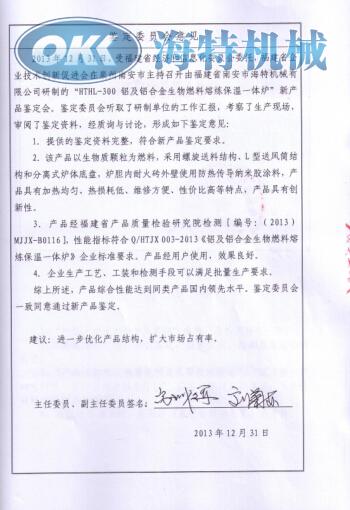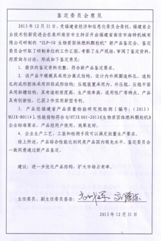 2013年三項(xiàng)產(chǎn)品, 生物質(zhì)固體燃料顆粒機(jī)、纖維干混攪拌機(jī)、 鋁及鋁合金熔煉保溫一體爐經(jīng)福建省新產(chǎn)品新技術(shù)鑒定為國內(nèi)領(lǐng)先水平