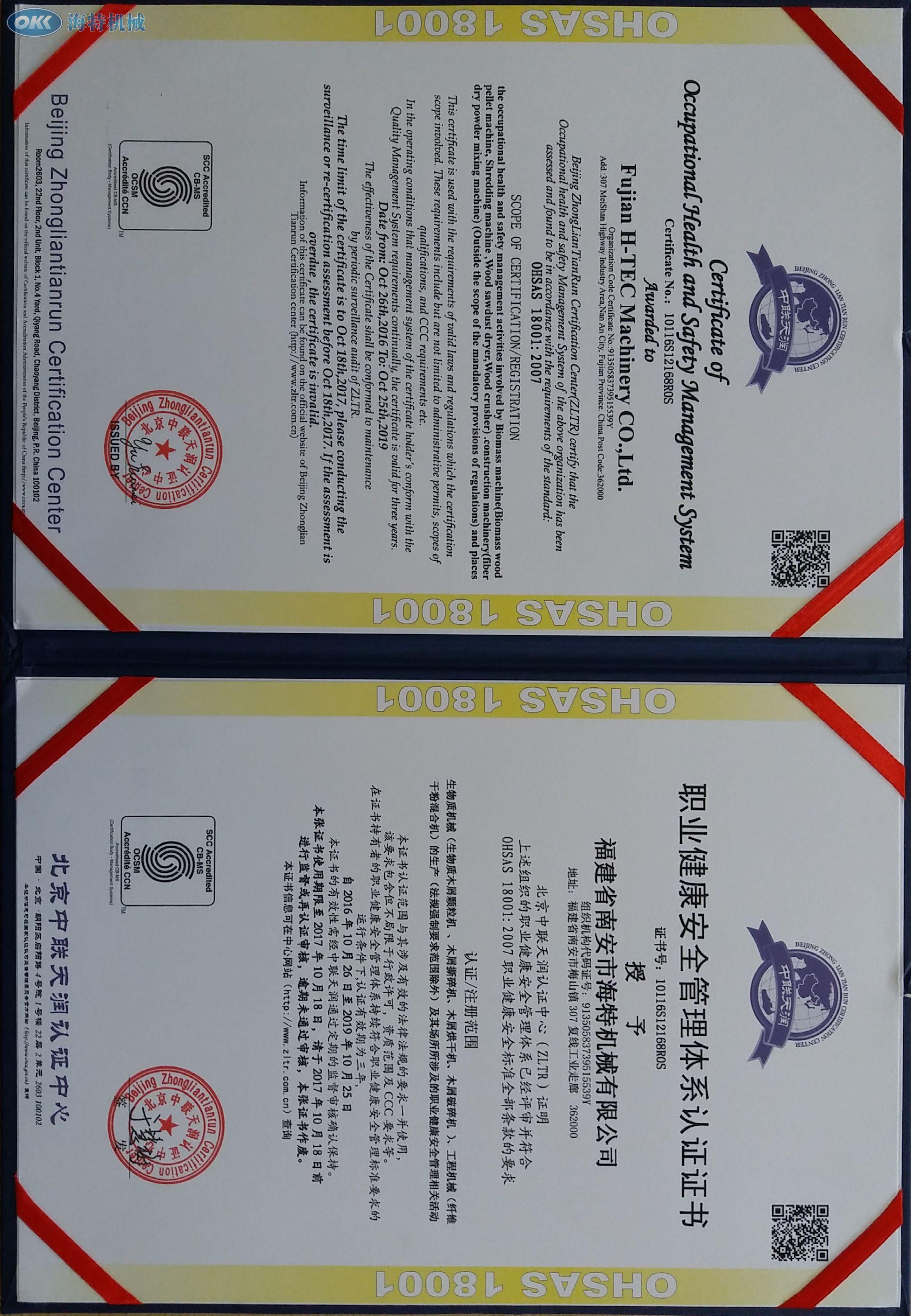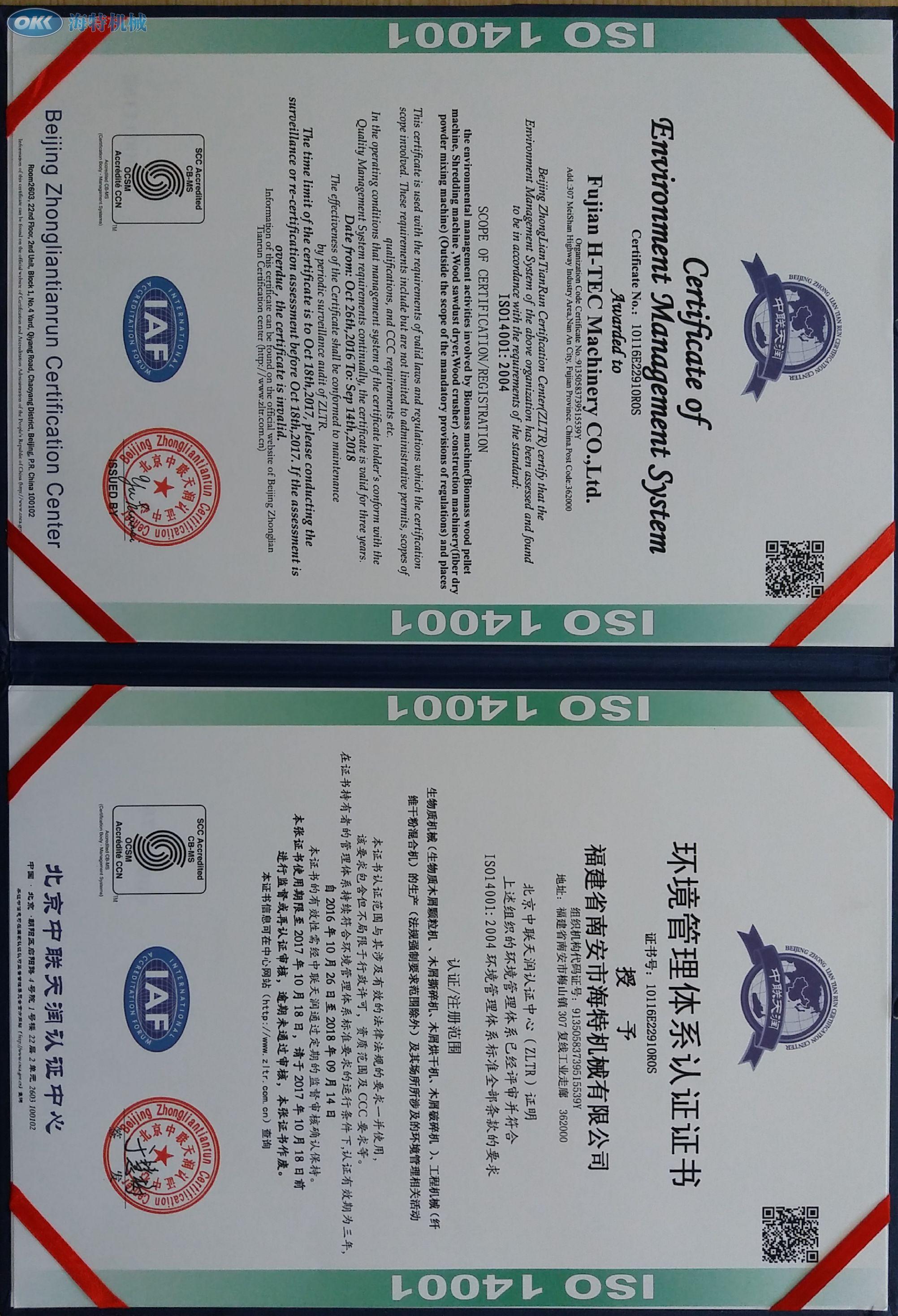 Certificate of Enviroment Management System; Certificate of Occupational Health and Safety Management System